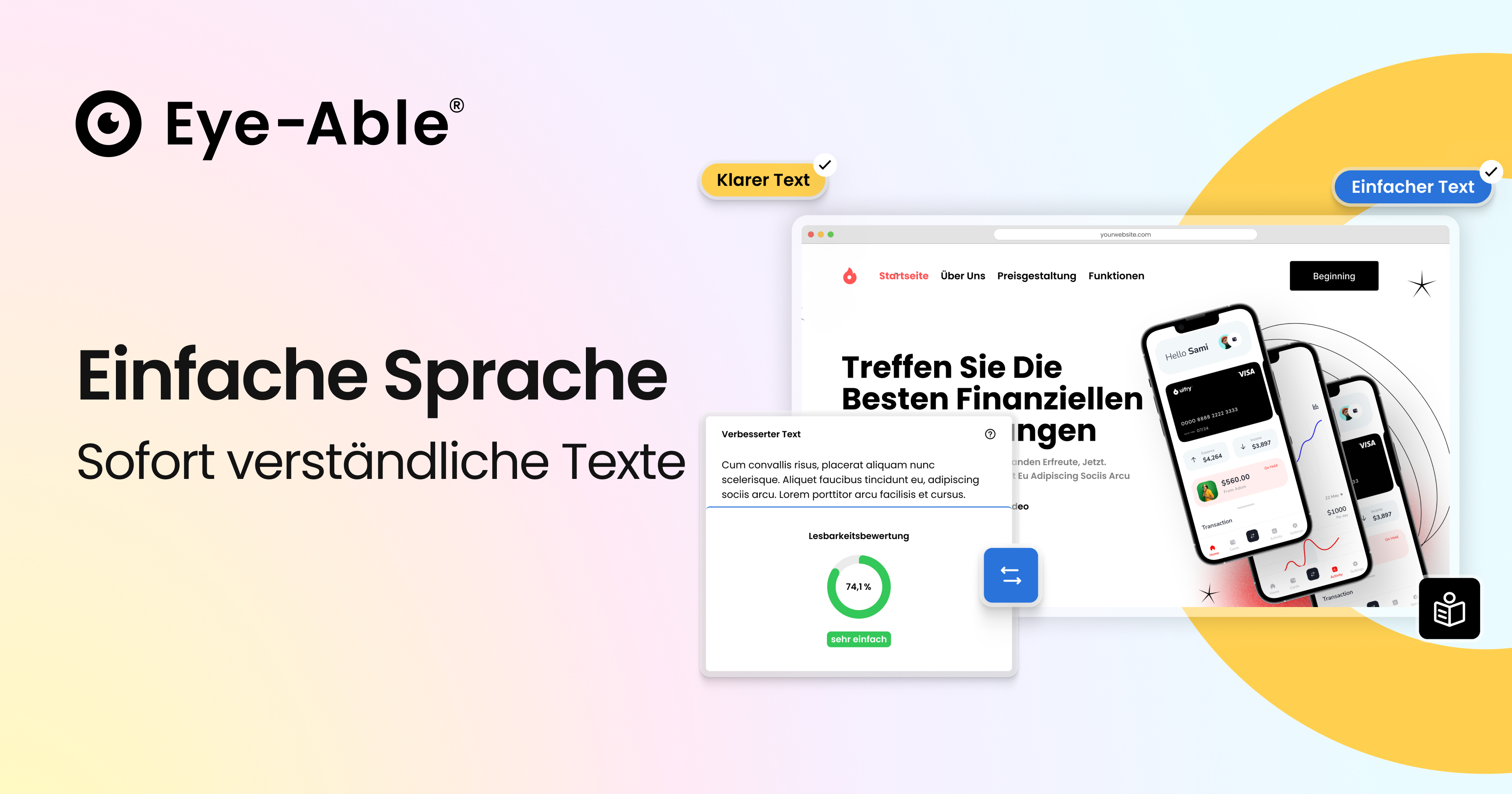 Eye‑Able Einfache Sprache nutzt künstliche Intelligenz (KI), um Inhalte zu analysieren und in eine klarere Form umzuwandeln. Zu den Funktionen gehören unter anderem:
