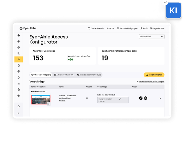 Mit Eye‑Able erkennst und behebst du viele Barrieren auf Webseiten automatisiert mit KI. Bereits 26 Fehlertypen können automatisiert korrigiert werden. Der Fokus liegt bewusst auf Problemen, bei denen KI zuverlässig funktioniert, etwa fehlenden Beschriftungen, die oft den Großteil der Fehler einer Seite ausmachen.