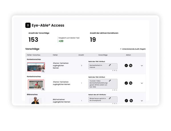 Automatische Tests decken viele Barrieren auf. Die Behebung kostet jedoch Zeit und Ressourcen. Eye-Able Access schließt diese Lücke: Viele Barrieren lassen sich mit wenigen Klicks direkt per JavaScript auf der Website abbauen, ohne Eingriffe in Code oder CMS.