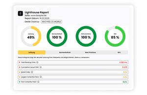 Lighthouse analysiert deine Webseite in den Bereichen Leistung, Barrierefreiheit und SEO. Es zeigt Schwachstellen wie lange Ladezeiten oder unzureichende Zugänglichkeit auf und liefert konkrete Handlungsempfehlungen. So steigerst du die Qualität deiner Webseite, verbesserst die Nutzerbindung und erhöhst deine Chancen auf bessere Suchmaschinen-Rankings.