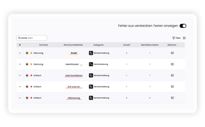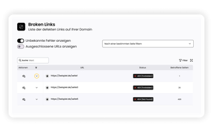 Fehlerhafte Links können die Nutzererfahrung deutlich verschlechtern und wirken sich auch negativ auf Suchmaschinenbewertungen aus. Mit der Content- & Web-Analyse werden diese Probleme automatisch erkannt und übersichtlich im Dashboard dargestellt. So kannst du schnell sehen, welche Seiten betroffen sind und die entsprechenden Links korrigieren.