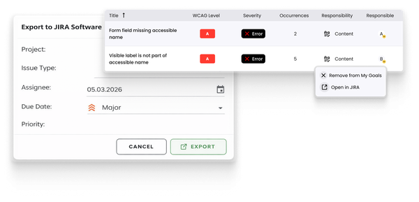 Accessibility issues identified through scans can be exported directly to JIRA. This allows you to manage all issues centrally and integrate them seamlessly into your existing development or content workflows.
